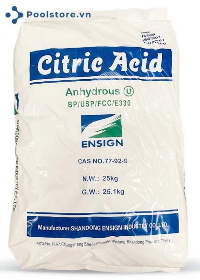 + Công thức hóa học: C6H8O7.H2O 99.5%