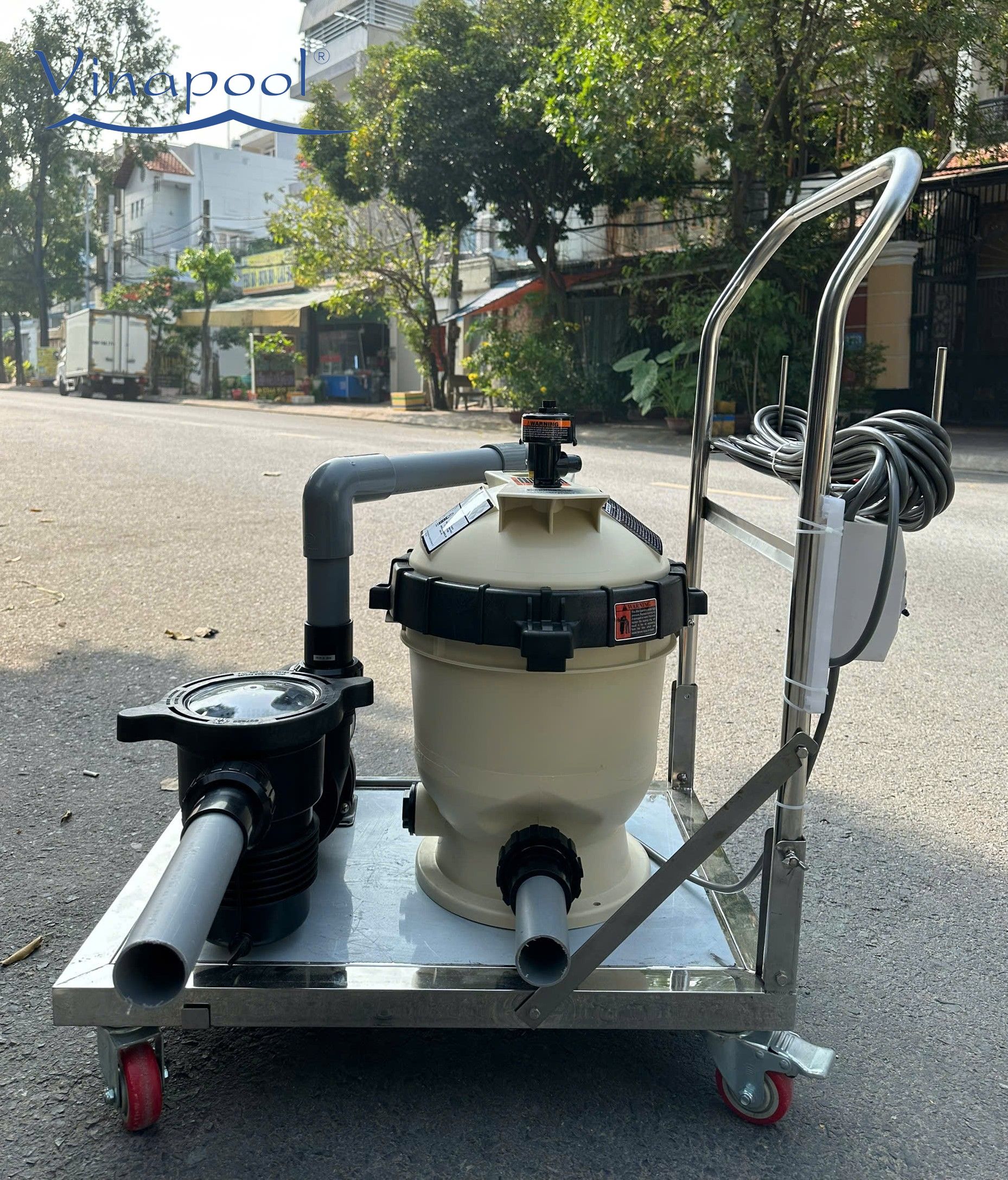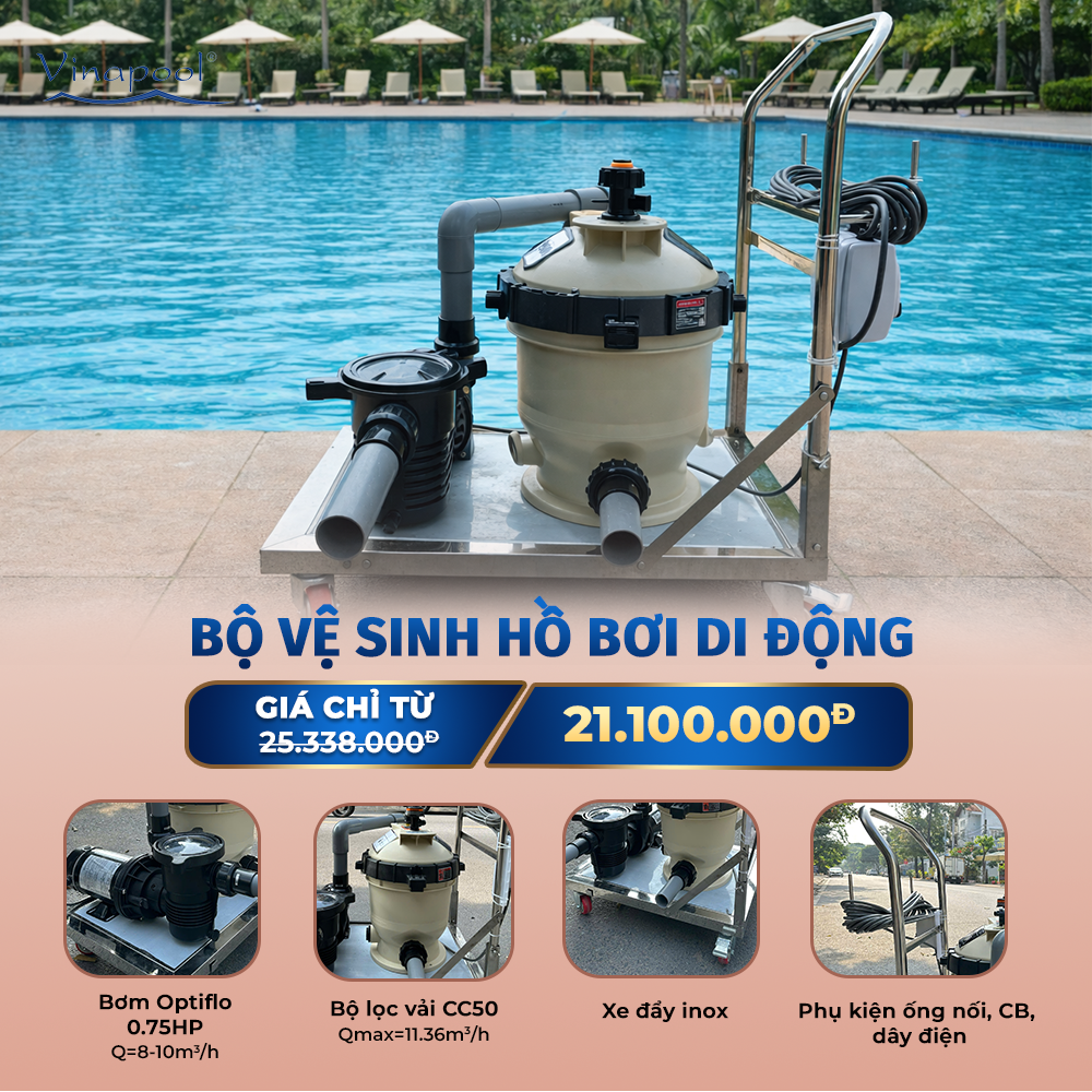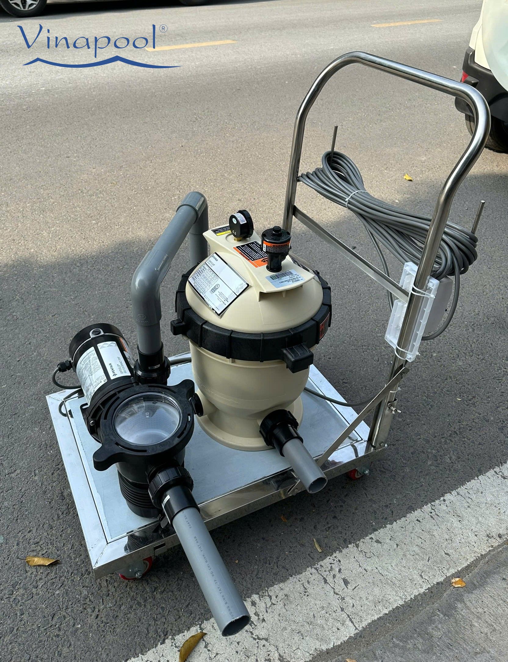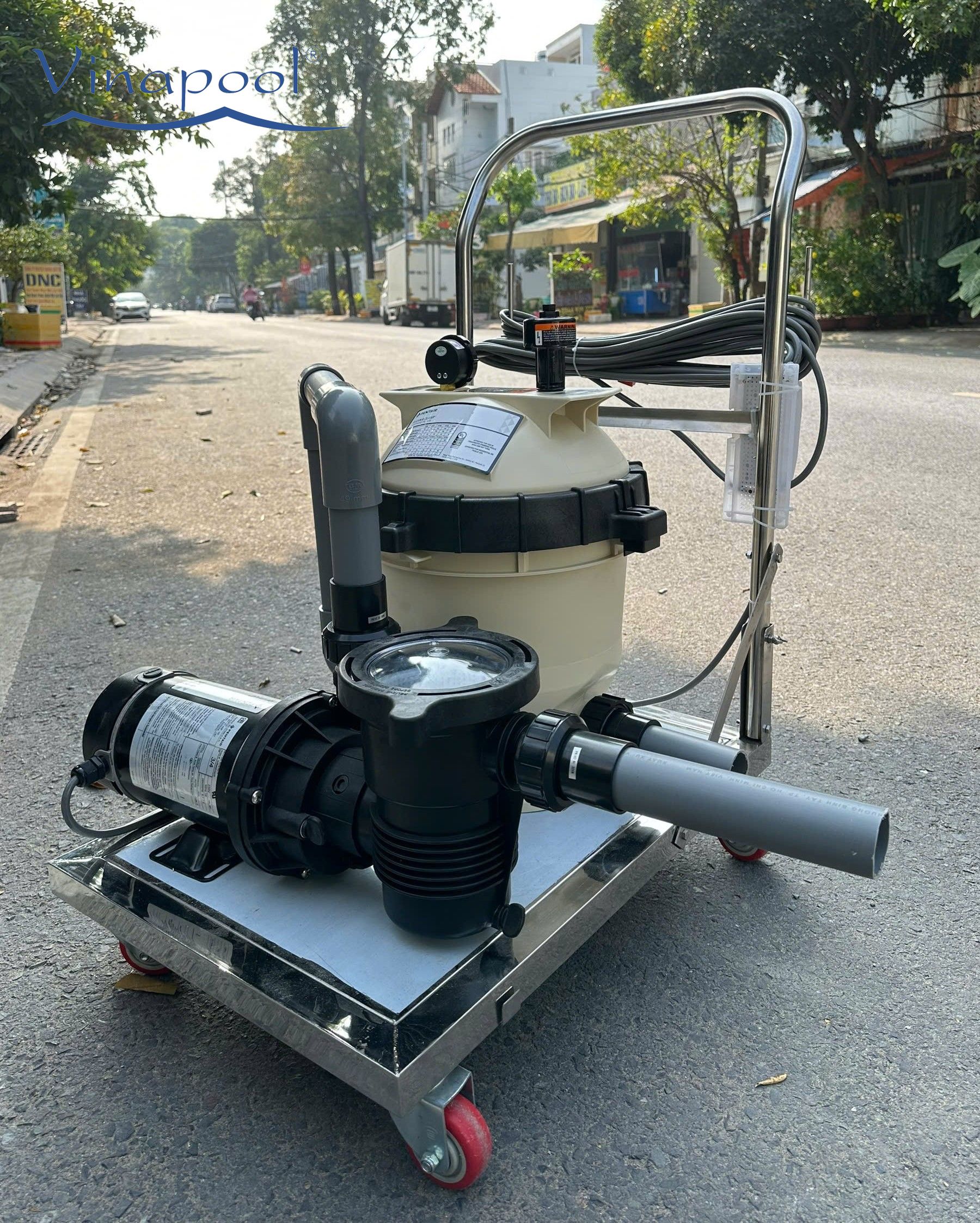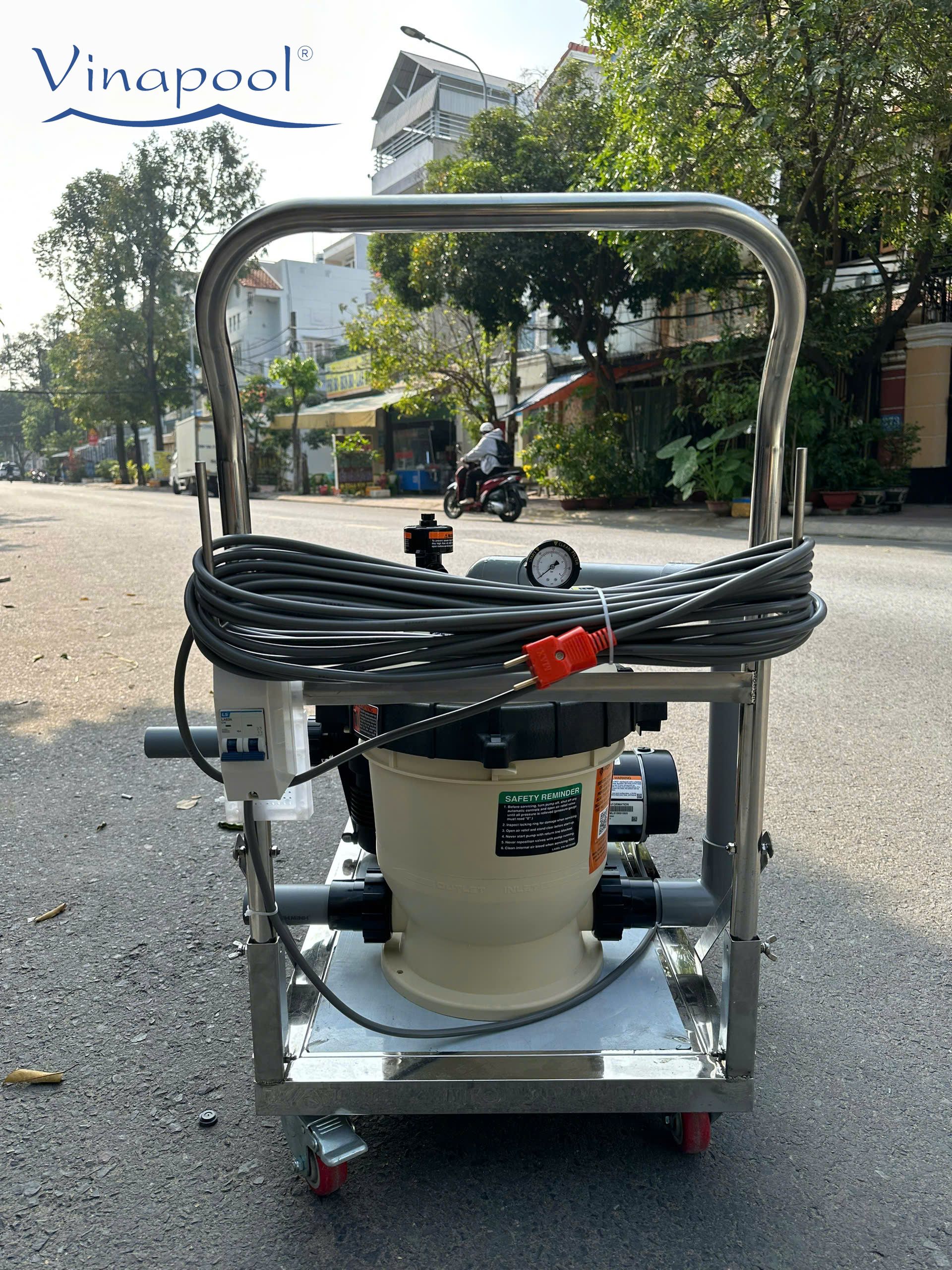-Bộ vệ sinh di động trang bị các thiết bị cần thiết, toàn bộ thiết bị được đặt trên xe đẩy thuận tiện trong việc di chuyển xung quanh bể bơi, đảm bảo làm vệ sinh nước bể bơi từ mặt nước xung quanh đến tận đáy hồ với thao tác vô cùng đơn giản…