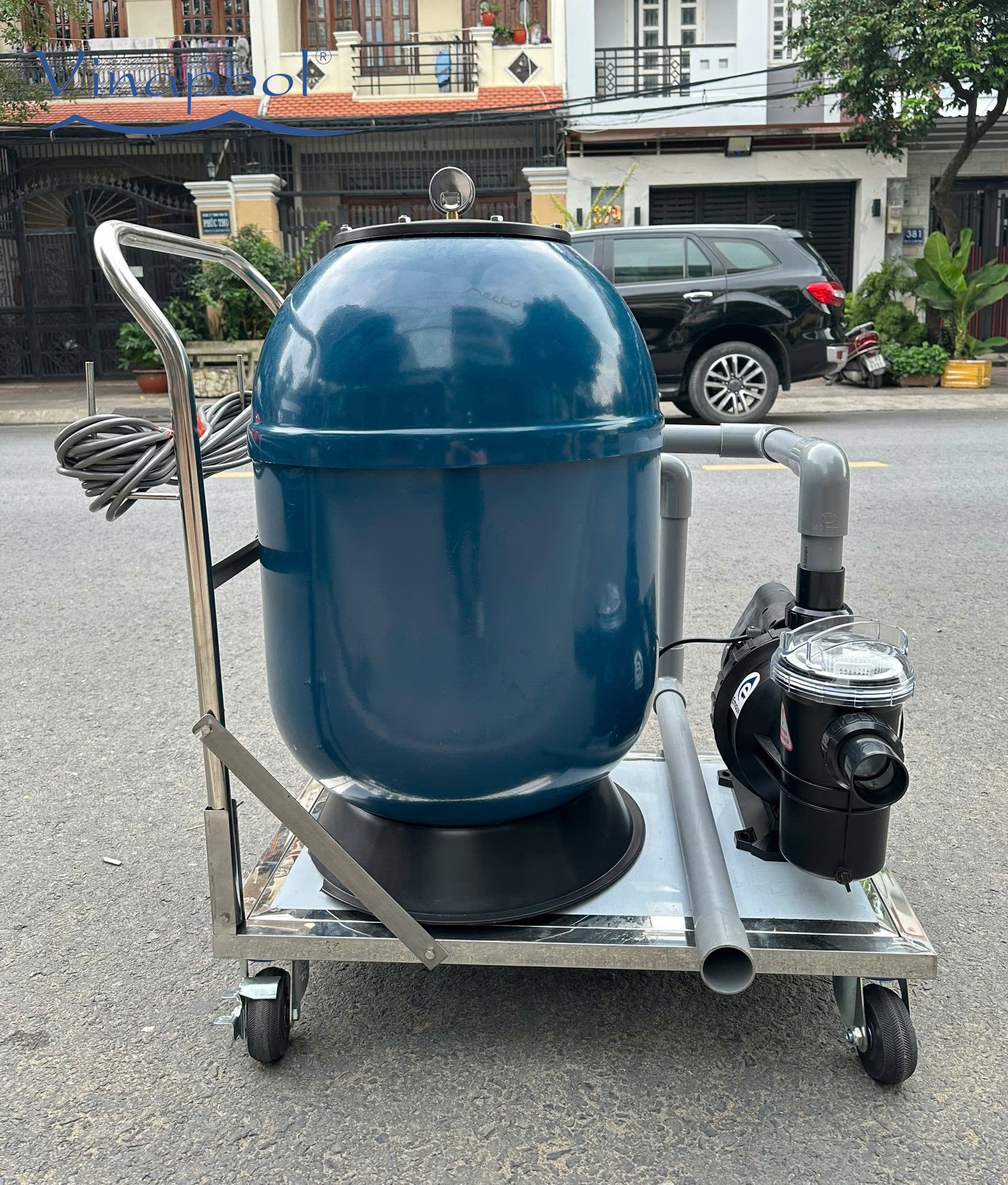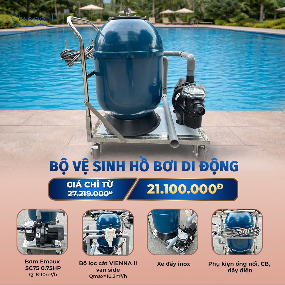 -Bộ vệ sinh di động trang bị các thiết bị cần thiết, toàn bộ thiết bị được đặt trên xe đẩy thuận tiện trong việc di chuyển xung quanh bể bơi, đảm bảo làm vệ sinh nước bể bơi từ mặt nước xung quanh đến tận đáy hồ với thao tác vô cùng đơn giản…