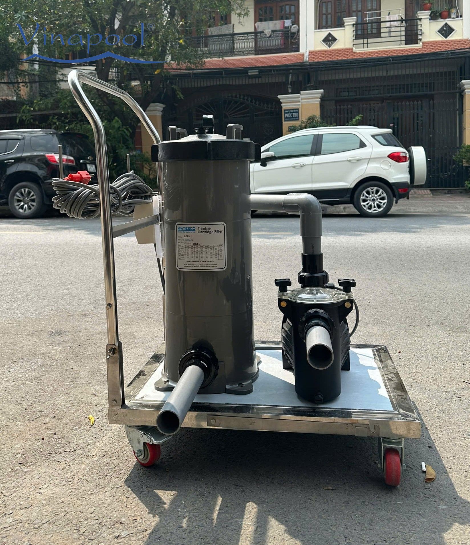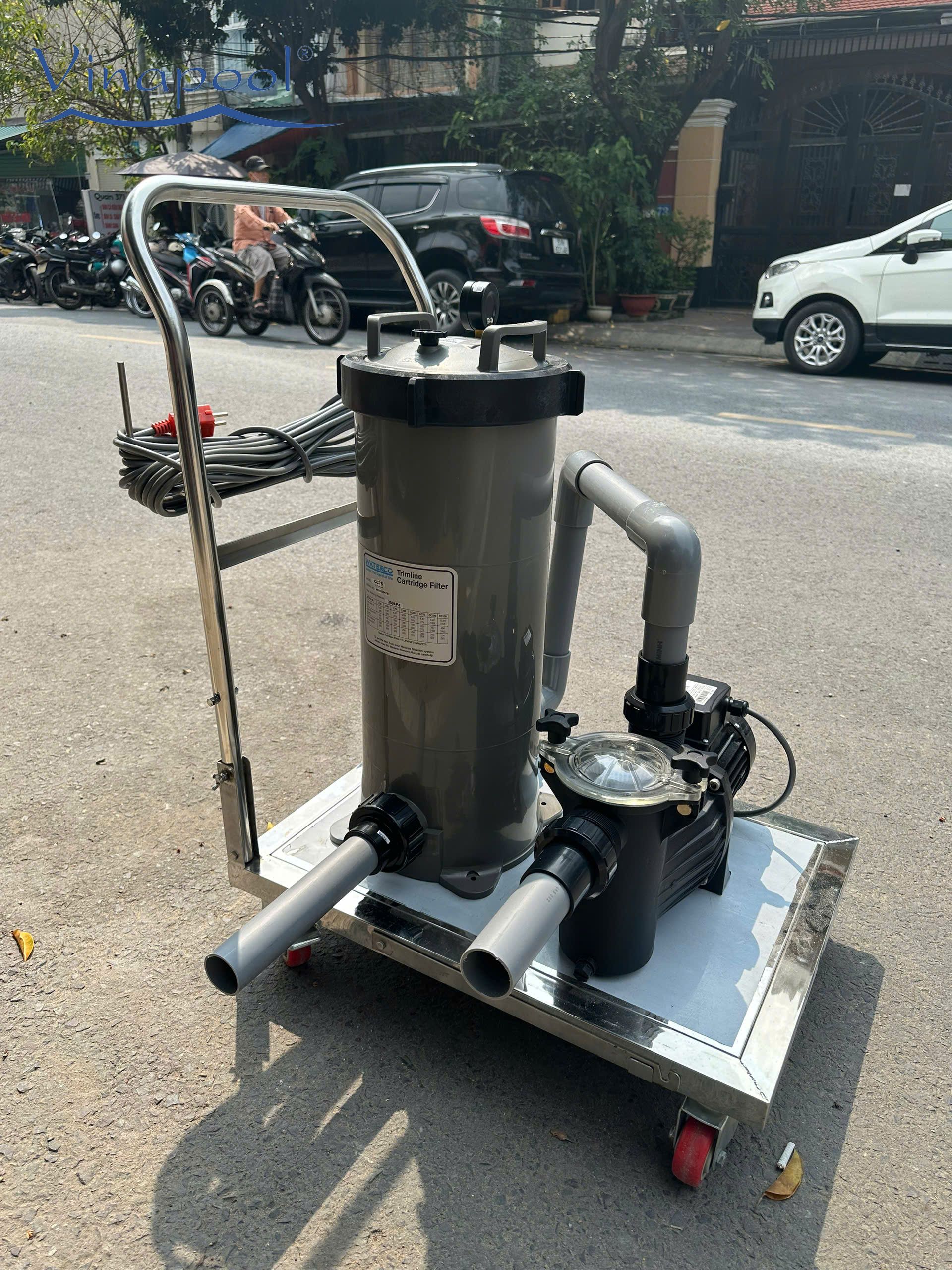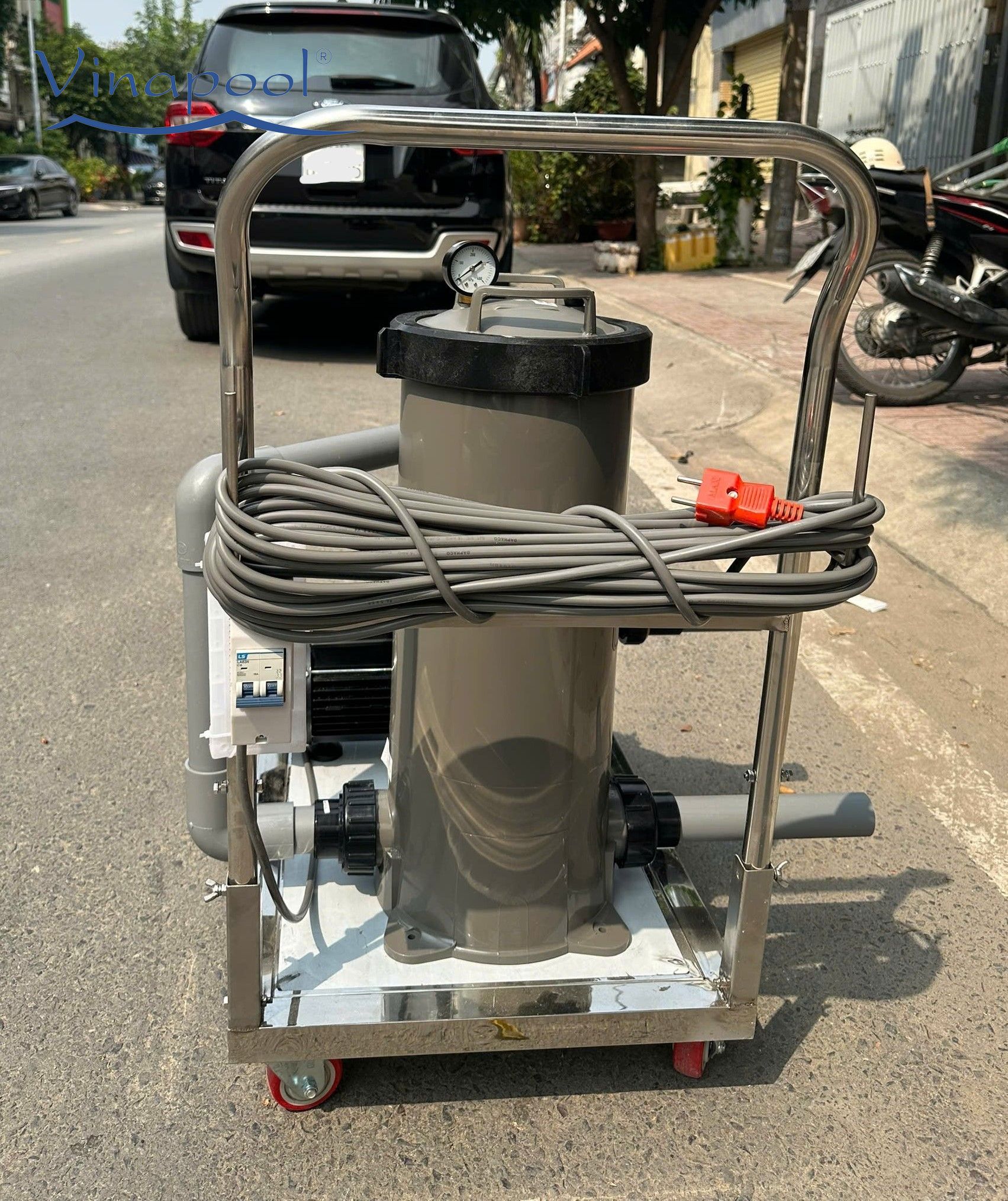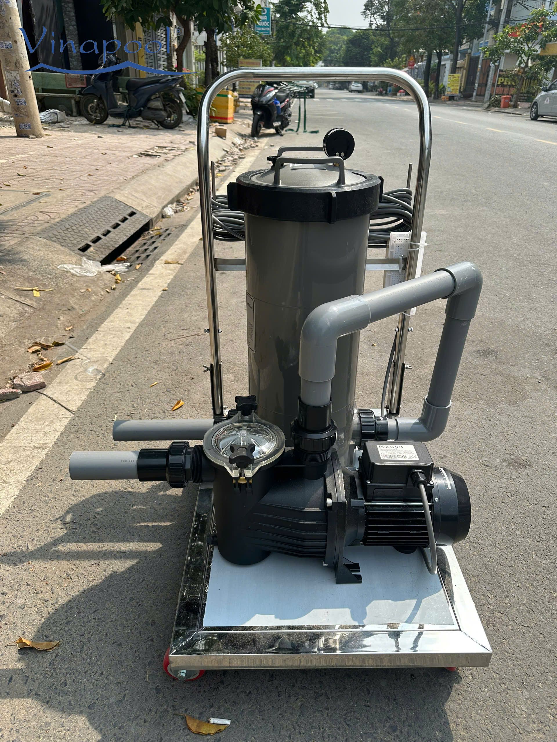 -Bộ vệ sinh di động trang bị các thiết bị cần thiết, toàn bộ thiết bị được đặt trên xe đẩy thuận tiện trong việc di chuyển xung quanh bể bơi, đảm bảo làm vệ sinh nước bể bơi từ mặt nước xung quanh đến tận đáy hồ với thao tác vô cùng đơn giản…