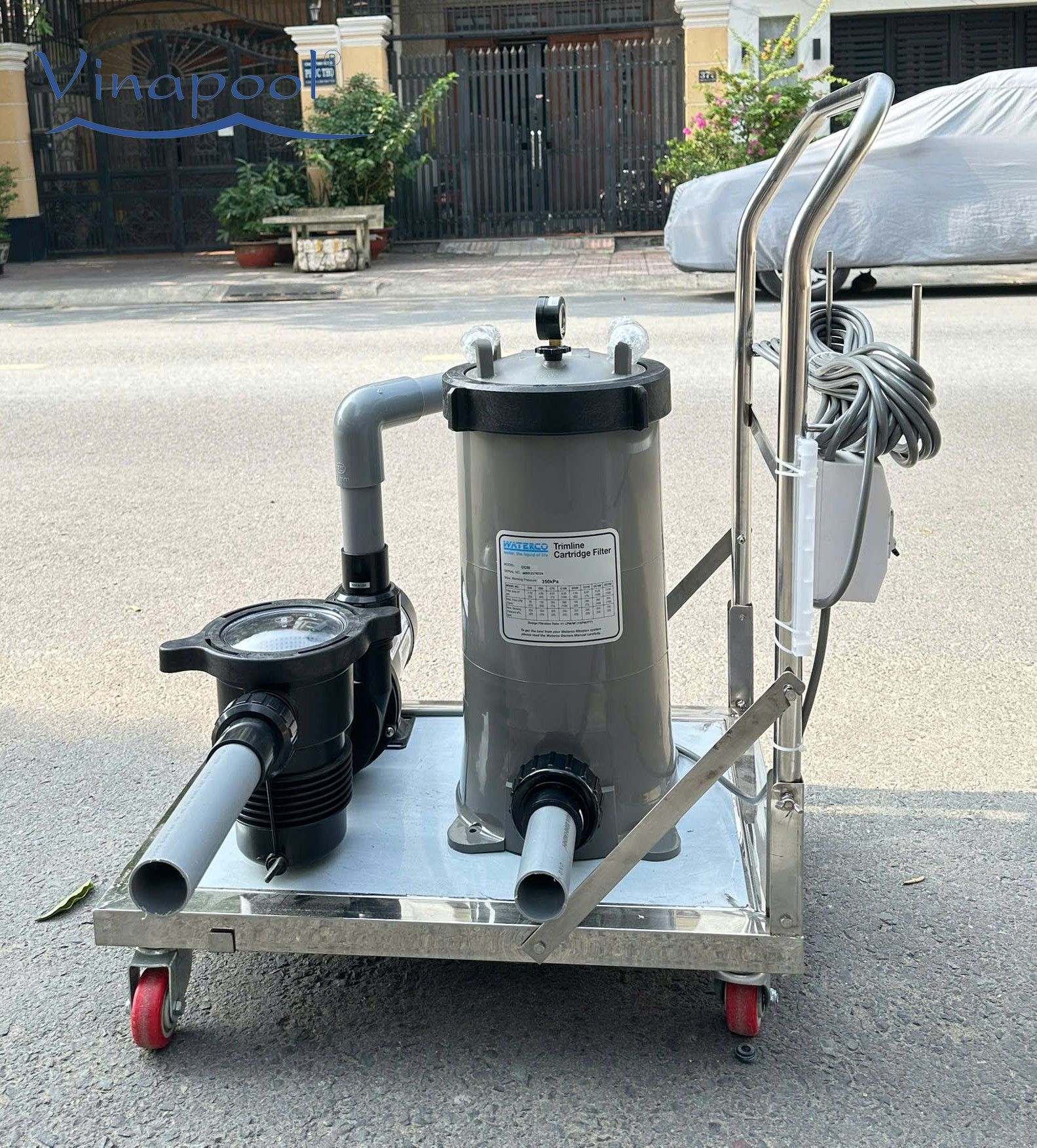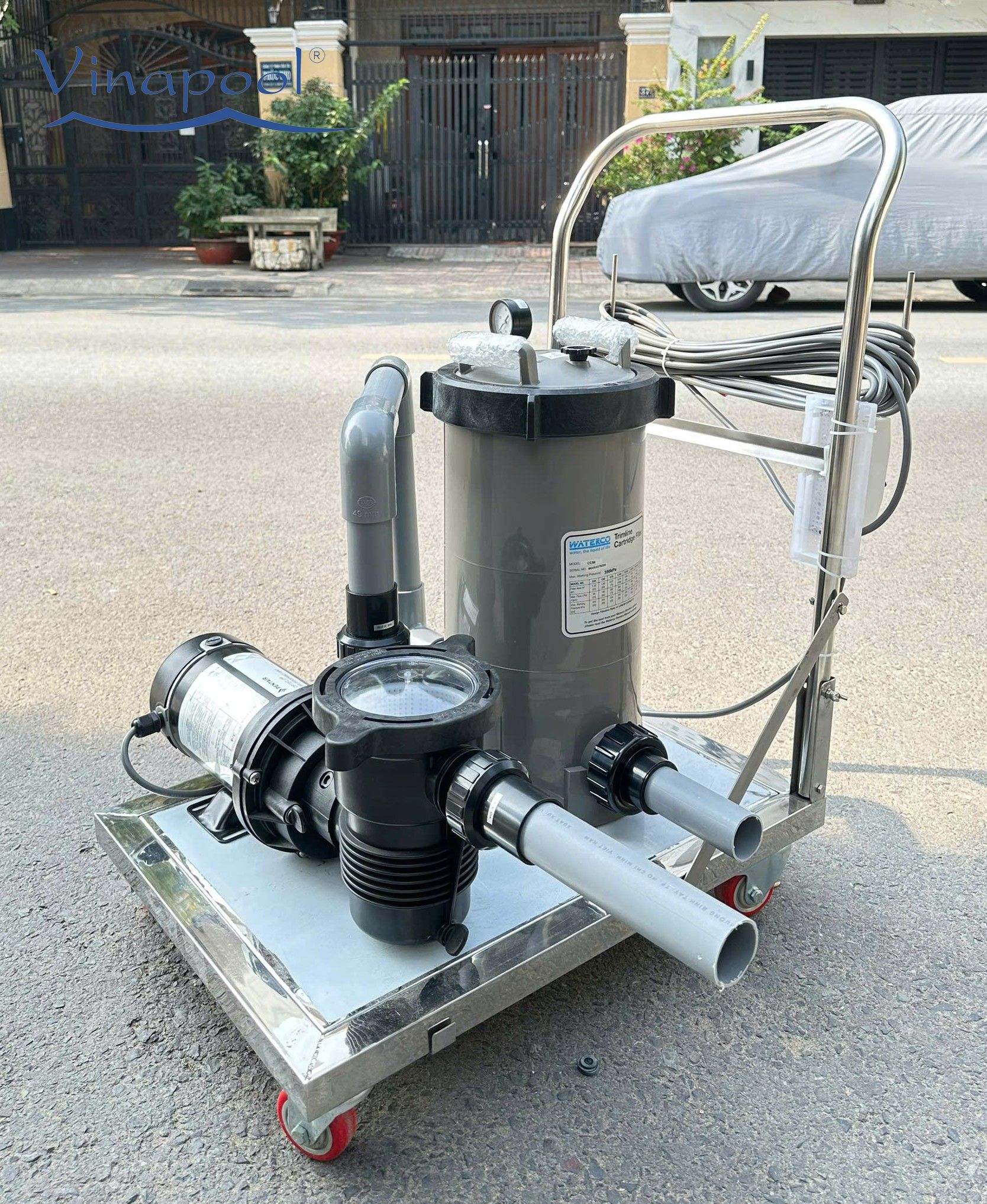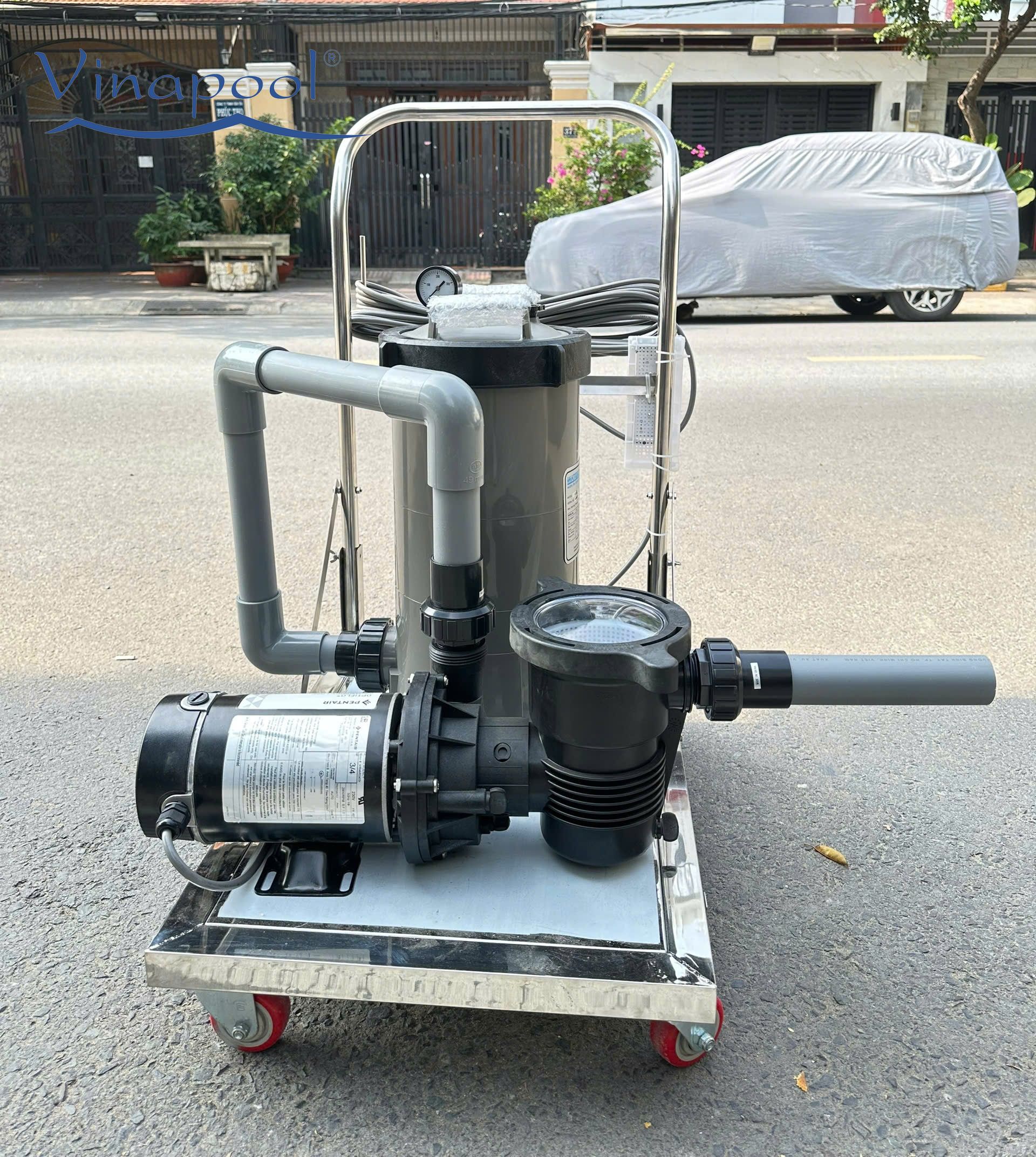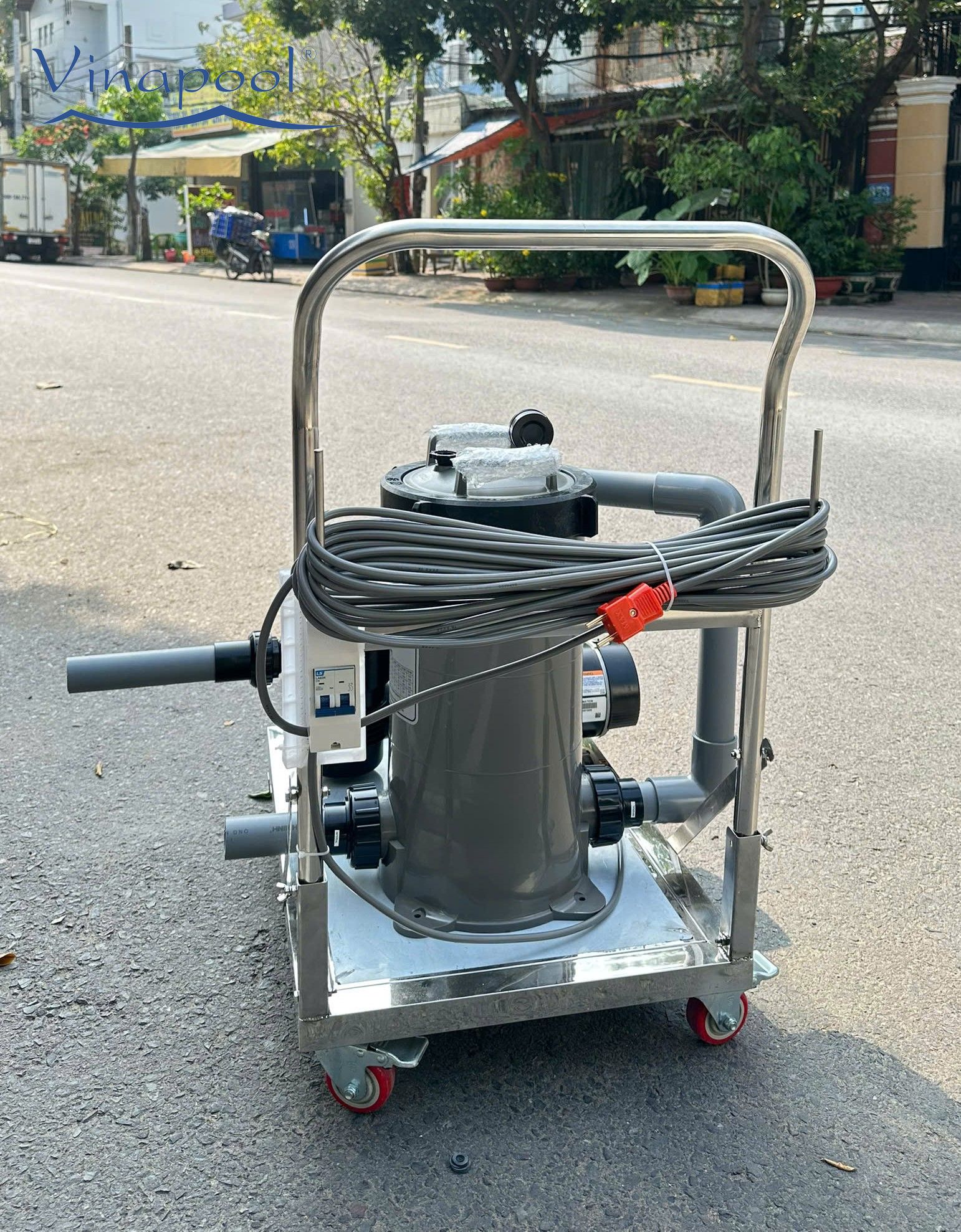 -Bộ vệ sinh di động trang bị các thiết bị cần thiết, toàn bộ thiết bị được đặt trên xe đẩy thuận tiện trong việc di chuyển xung quanh bể bơi, đảm bảo làm vệ sinh nước bể bơi từ mặt nước xung quanh đến tận đáy hồ với thao tác vô cùng đơn giản…