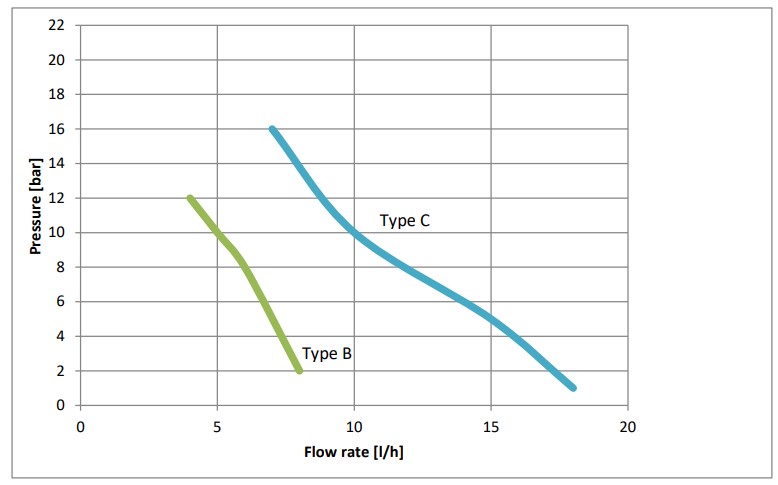 Chỉ với 3 kích thước, có thể đáp ứng nhiều loại hiệu suất, có phạm vi lưu lượng từ 4 đến 110 l/h và áp suất lên đến 16 bar. Nguồn điện là 100÷240 Vac – 50/60 Hz do đó cùng một máy bơm có thể hoạt động với điện áp cung cấp khác nhau.