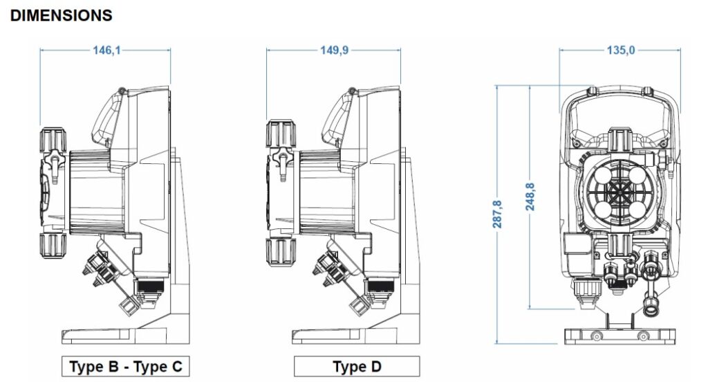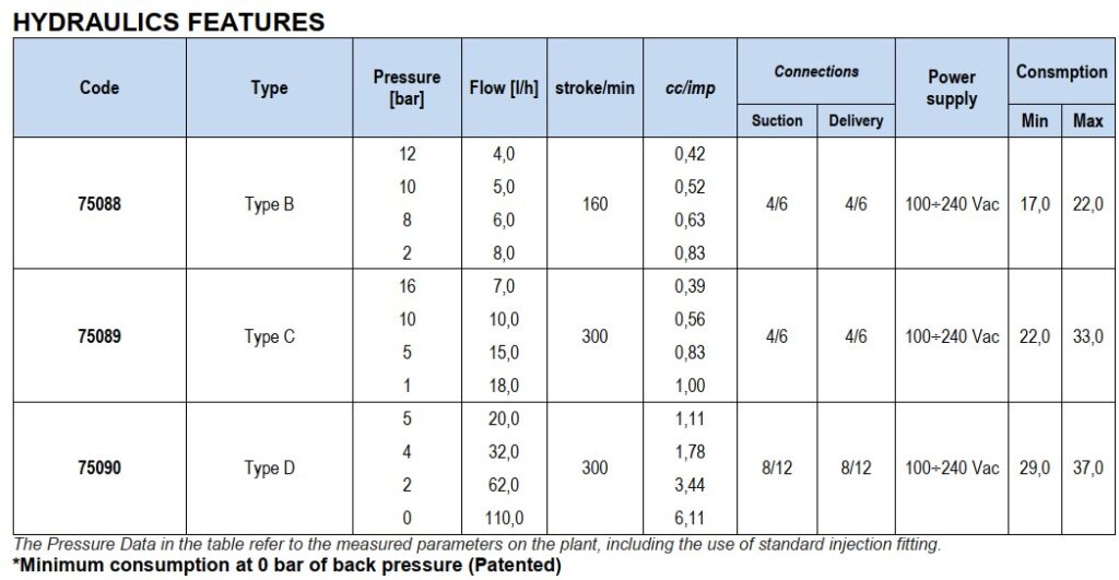 Chỉ với 3 kích thước, có thể đáp ứng nhiều loại hiệu suất, có phạm vi lưu lượng từ 4 đến 110 l/h và áp suất lên đến 16 bar. Nguồn điện là 100÷240 Vac – 50/60 Hz do đó cùng một máy bơm có thể hoạt động với điện áp cung cấp khác nhau.